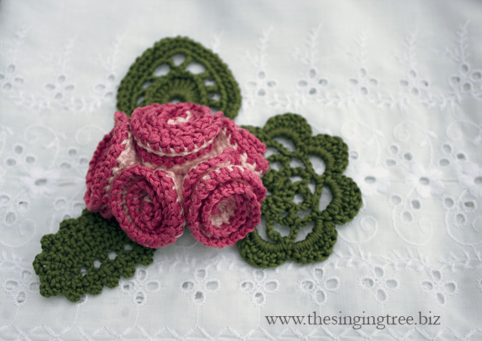 Curl the crochet into roses and use the yarn tails to weave them into place – all done.