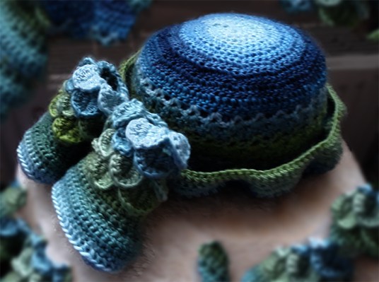 The yarn is Elann Pippilongcolor (*update 2019 – the yarn has been rebranded to Impromptu Lite*) in Crystal Spring shades, perfect for a pair of crocodile stitch bootees and a little hat. The pattern is a free download from MyLittleCityGirl.
