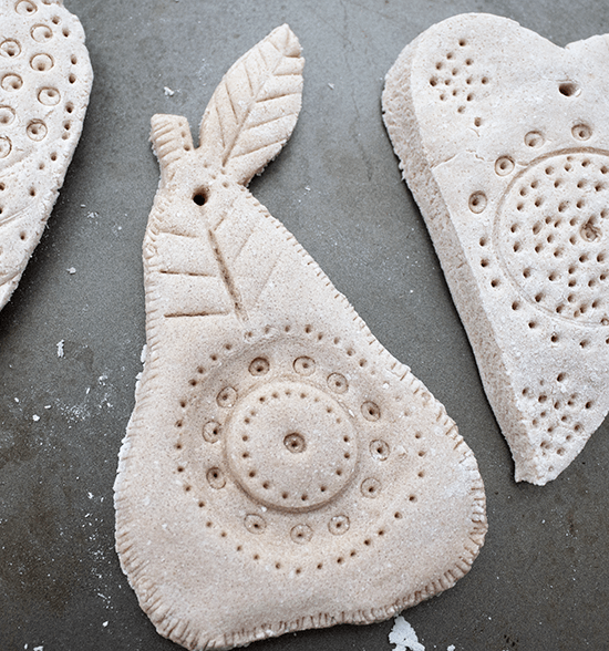 You can create all sorts of things and hang them up afterwards – just make a hole so you can insert cord or wire to hang them from – or, insert some bent wire into the raw dough (wet the ends of the wire with a thickish flour and water mixture ‘glue’ then insert the wire into the piece) and bake the mount with the dough. I