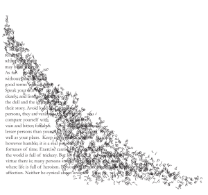 This column of text looks like its edges have been eroded away or blown off. It was all done in Illustrator. It’s made from a column or shaped text box filled with text. I made a number of Scatter brushes using individual letters. Simply type a letter or two, in the same font and font size, as the column of text then go to Type>Create Outlines. This turns text into editable shapes.