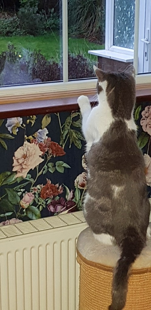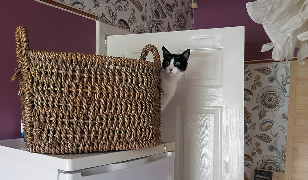 Charlie, looking uncharacteristically spooked. He must have thought the bailiffs were after him. He’s the most laid-back cat I’ve ever known. Loud noises, crashes or even the dreaded vacuum cleaner, barely disturbs him.
