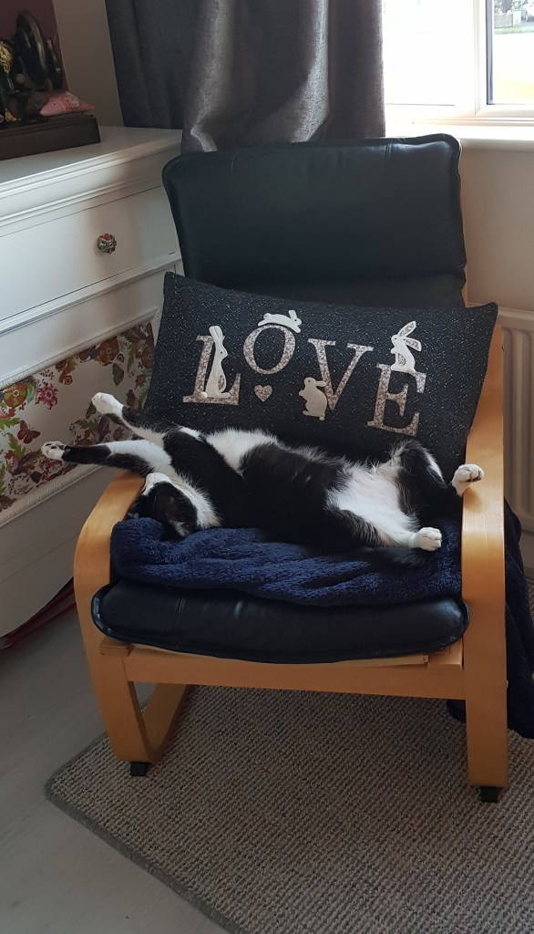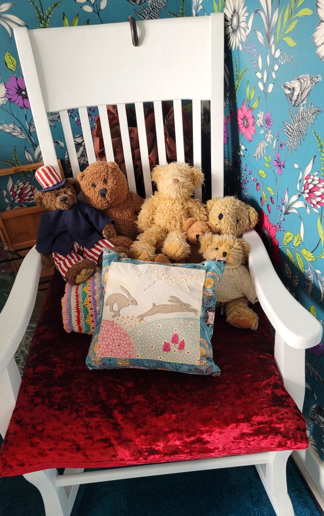 They are sitting on a lovely rocking chair that I got from a charity shop some time back. It was a bit of a knacker but we repaired it and restored its looks with a fresh coat of paint. Scrubbed up well, eh?!