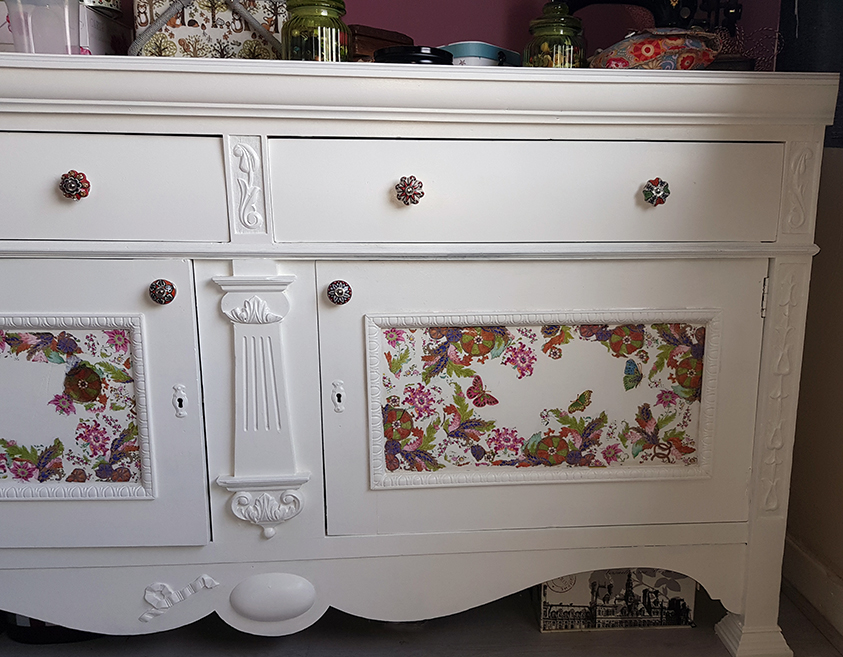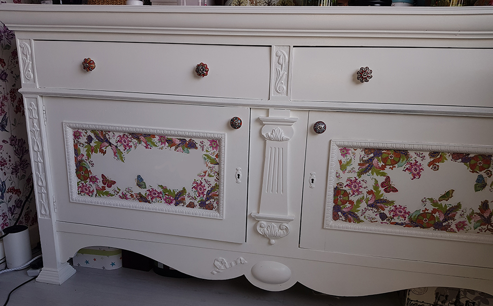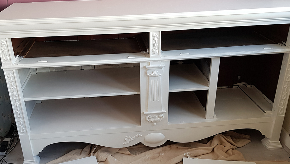 Typical old, dark sideboard from a granny house. Two-door, two-drawer, solid and strong. No pictures of it in original state but was skanky, manky, dirty and nasty. Cleaned up well and given first coat of off-white satin paint. Husband, Mr Bee, does the painting. Not me.