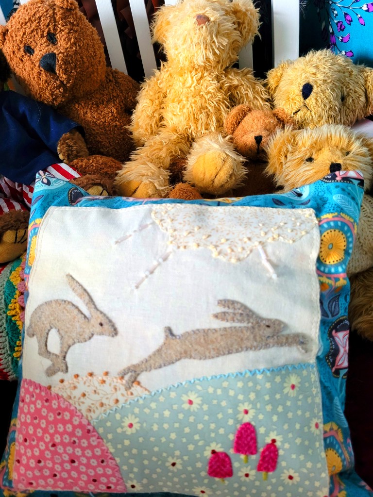 I also found an appliqué cushion that I made yonks back. The hares were applied using Bondaweb then stitched round: