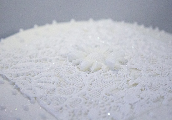 The mat and Flexilace were Christmas presents and today was the first time I’d used them. If you’ve never made Flexilace before, a word to the wise – a little goes a very long way. I made up 50g of Flexilace to 75ml of cooled water and had enough to make all sorts of lace bands and butterflies and other doodahs (another set of silicone moulds received (with joy) for Christmas).The good news is that they keep well in a ‘wallet’ of greaseproof paper. I only intended to make the single mat pictured above, though! I think 12g and 17ml of water would have done.