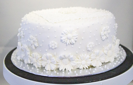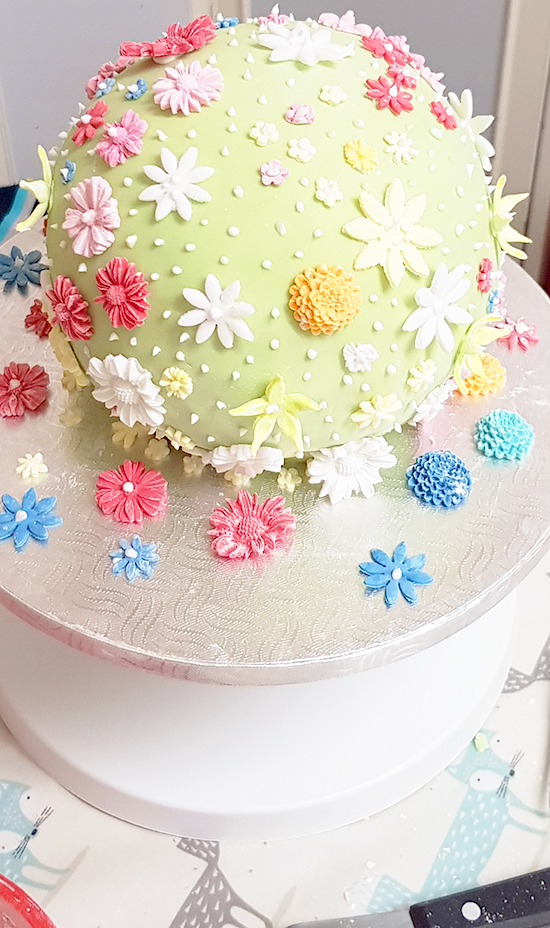I have a confession. This cake is actually the Christmas cake that I didn’t ice in time for the big day. It’s been maturing with lots of brandy sprinkles and feeds since last August and smells divinely fruity, rich and heady. I got to it this morning. It really is a properly rich fruitcake. with black treacle and lots of dried fruits. It’s covered in marzipan and roll-out fondant (I actually like the Shamrock brand of roll out fondant. Used to hate the stuff for having a plastic flavour but the Shamrock fondant is really nice). The flowers are made from fondant as well and the bibbly-bobblies are piped on using Royal Icing.