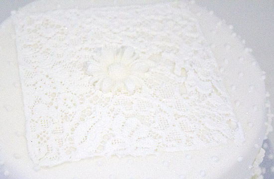 I used a little squinch of royal icing here and there on the top of the cake to secure it into place then topped it with a final flower. To finish it all off I used a dry paintbrush to flick pearl lustre-dust over the cake to give it a little shimmer. You can see the bokeh effect in the middle picture. They’re not Photoshopped sparkles.