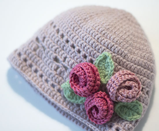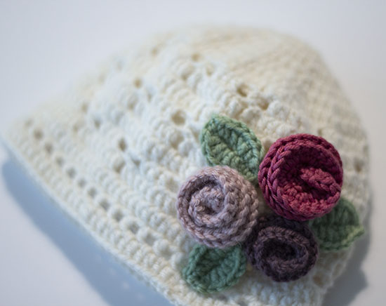 I used Debbie Bliss Baby Cashmerino, an extrafine merino wool and cashmere blend, using 3.25mm hooks for both beanies and the flower embellishments