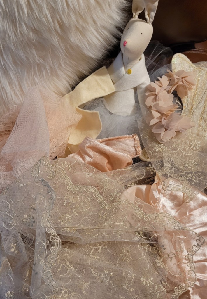 Got two more ready to sew plus new clothes. I was lucky with a couple of charity shop trawls that found me some lovely dresses with sparkly sequinned tulles over ‘satin’ linings. The lining is great for making pantaloons and knickerbockers. One had a feather trim used for the feather hat above. Loads left. Of everything.