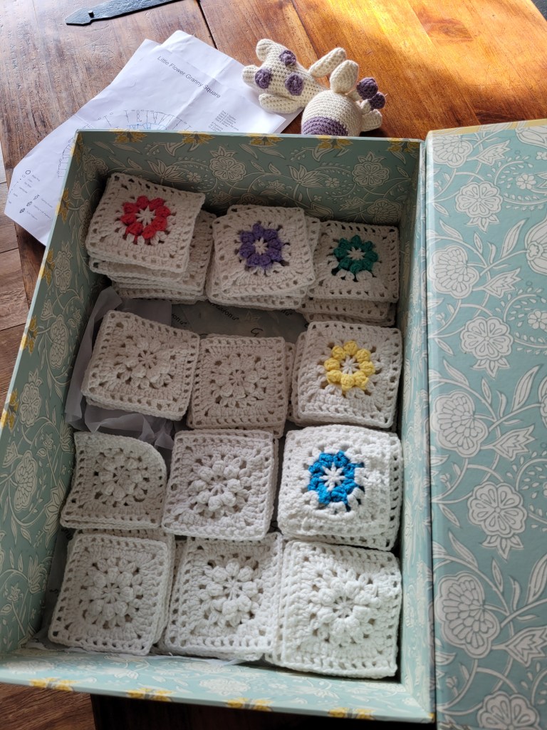 Managed to finish off the baby blanket and hat for the local animal shelter charity shop. The pattern was fab. It was full of bobbles, shells and Biba windows (that’s my name for them cos they very loosely remind me of the Biba logo: