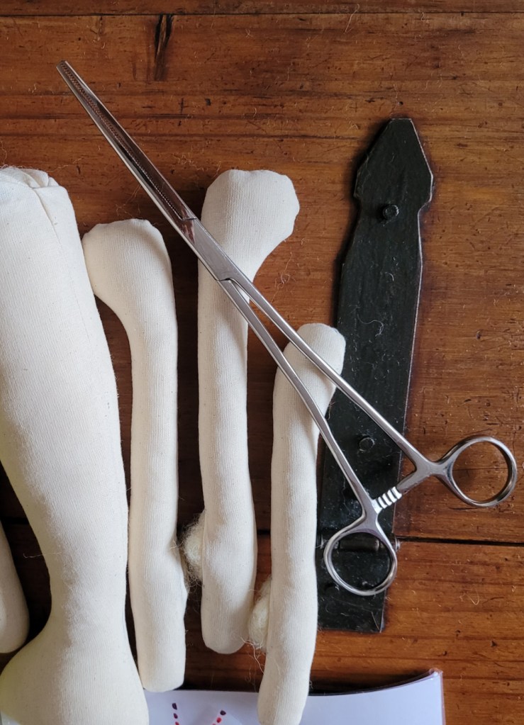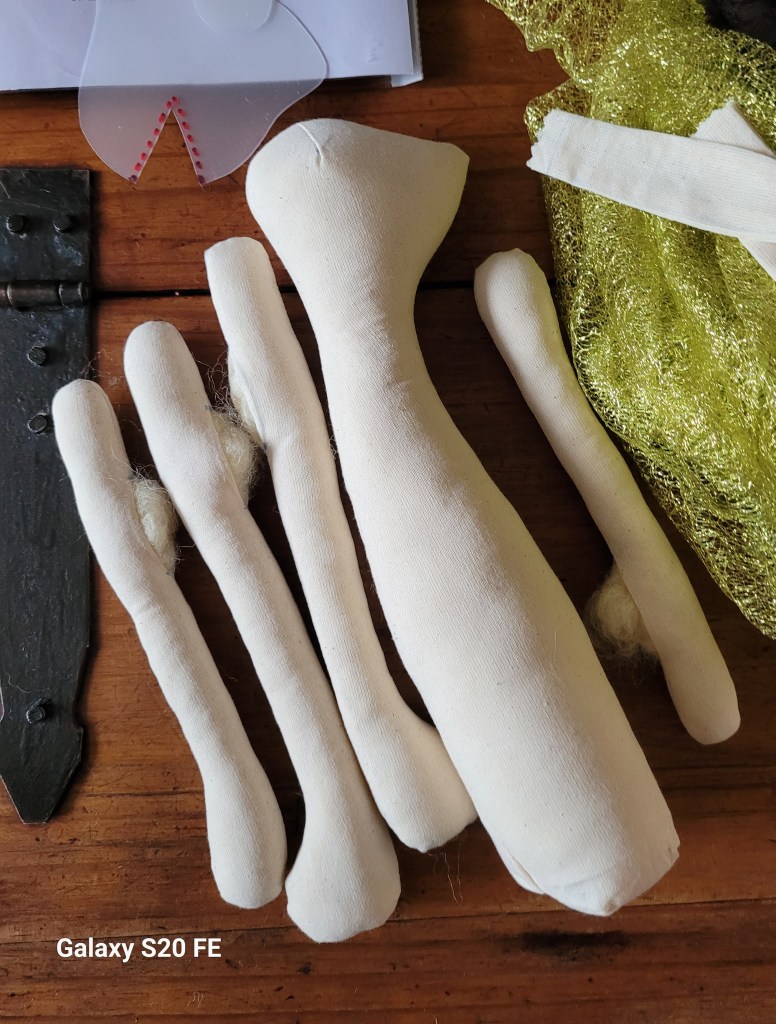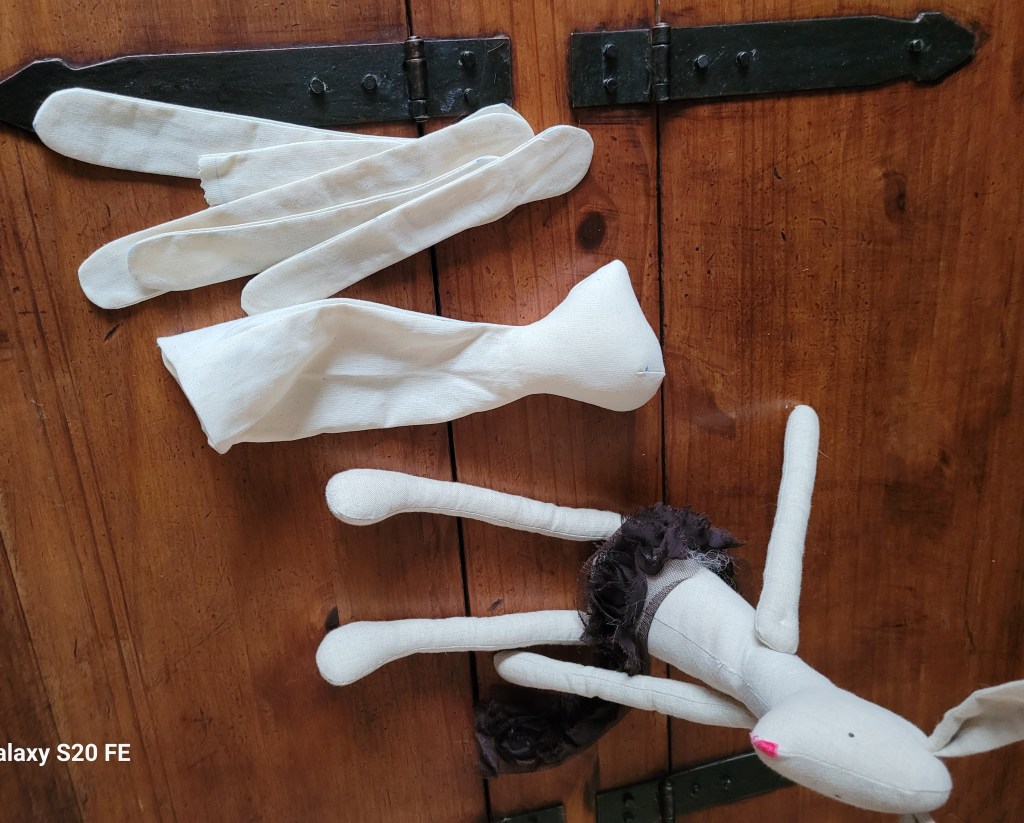 A lot of work went into making her clothes, including modesty undergarments (of course) and really like the choice of fabrics. But her face… I may paint it off with acrylics and give her a make over. Another doll is cut out, stitched just waiting to be stuffed. And some clothes ready-made and lovely. Maybe she presents a second-go to create a beautiful version. They could sit like book ends. Like Mrs Bedonebyasyoudid and Mrs Bedonedonebyasyouwould bedoneby (if memory recalls the Water Babies correctly).
